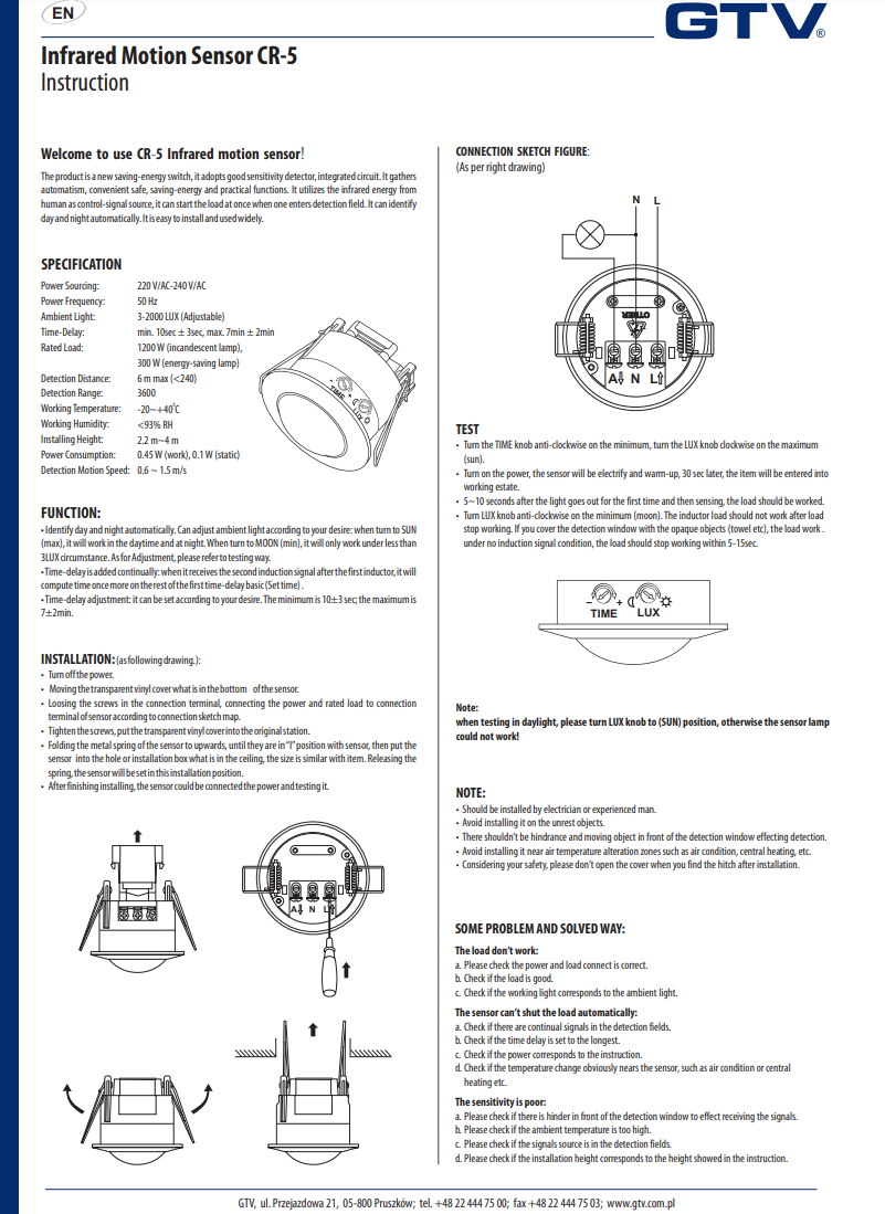 The GTV CR-5 motion sensor detects infrared radiation and is designed for optimal performance.