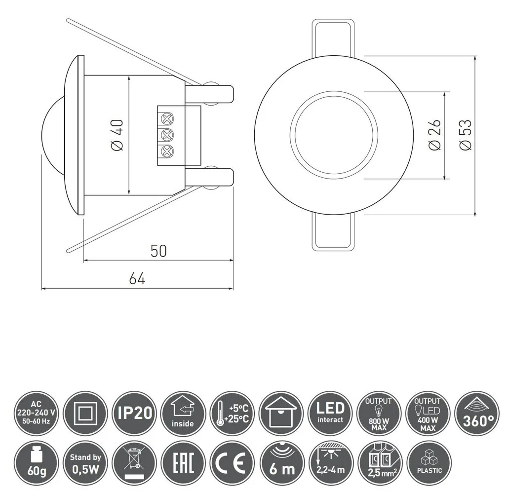 The GTV CR-5 Mini is a recessed motion and twilight sensor, ideal for both indoor and outdoor applications. Here are its key specifications and features: