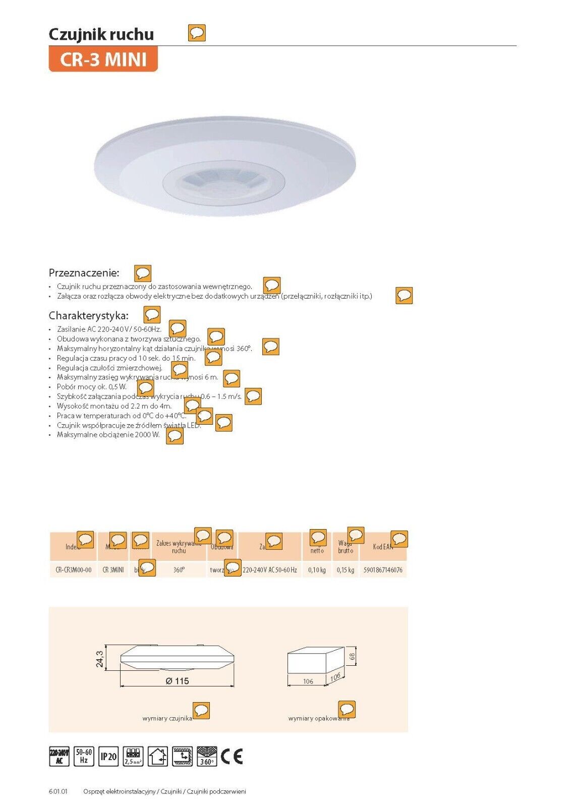 The GTV CR-3 MINI motion sensor is an advanced device that detects infrared radiation within a 360° range. The sensor activates connected devices upon detecting human heat in the infrared band within the detection zone.