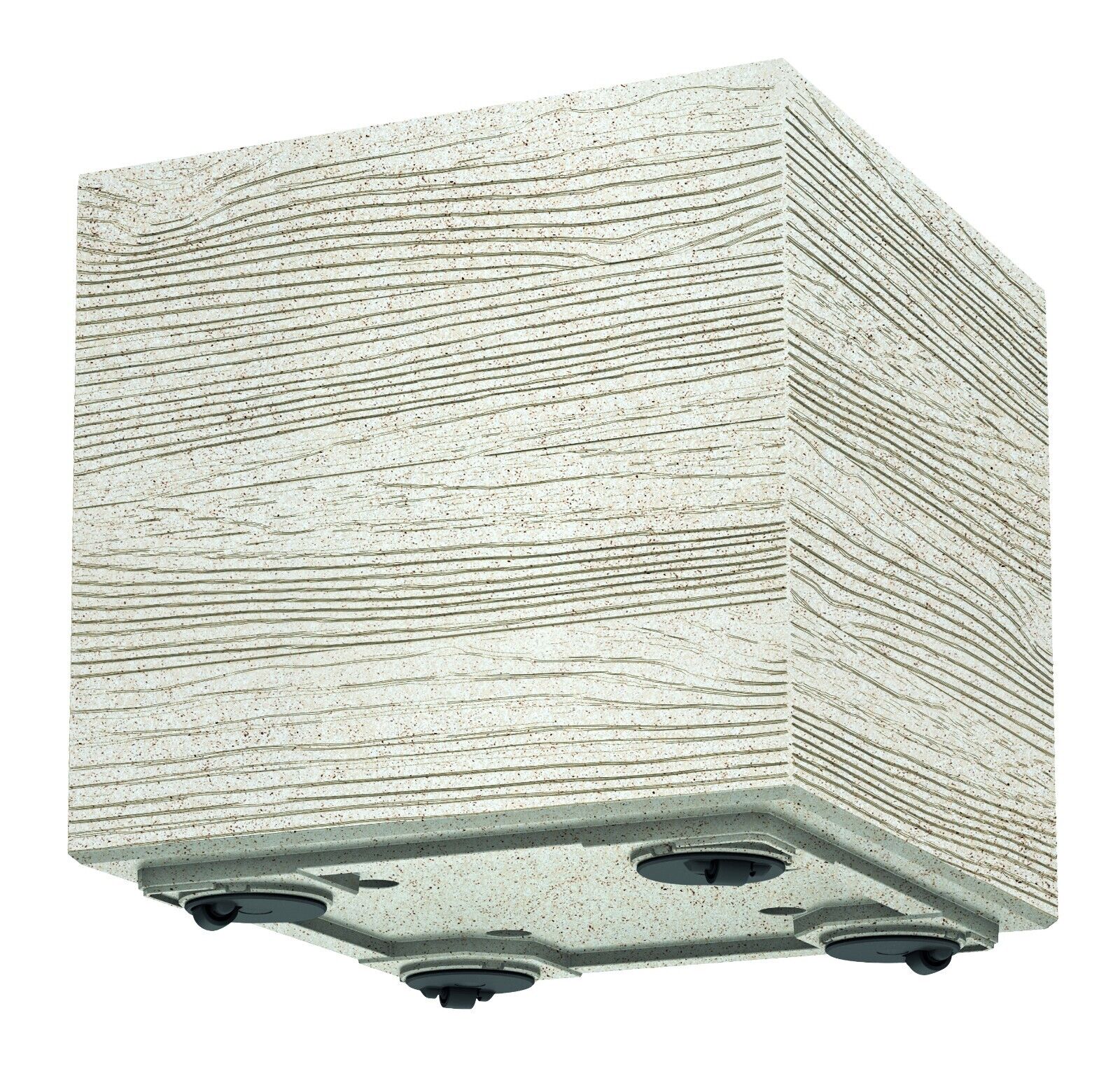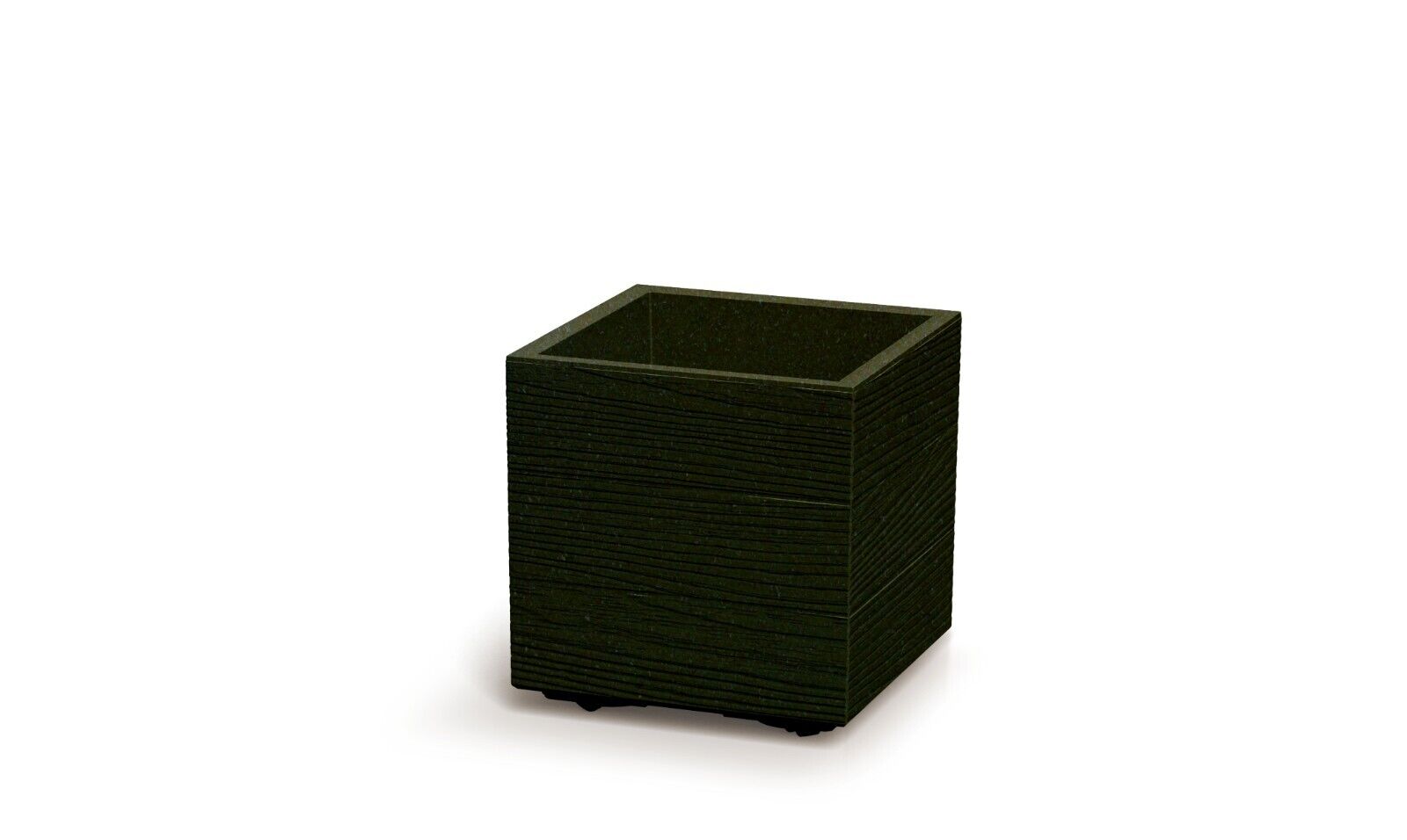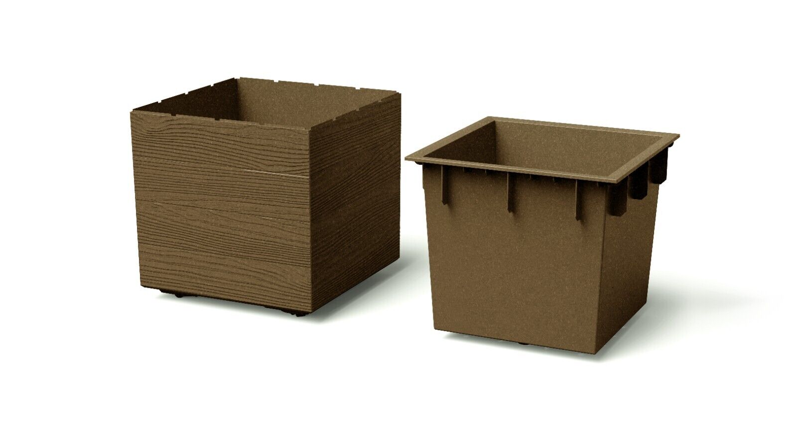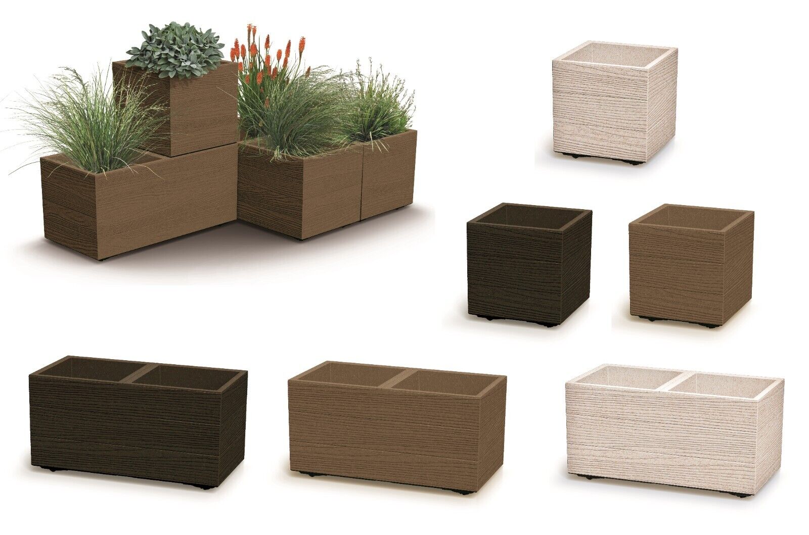 Equipped with internal inserts, the planter makes transplanting and water drainage easier. The built-in wheels at the bottom allow for easy movement of plants. The distinctive texture, inspired by natural wood, gives the planter the appearance of a wooden crate, while its construction mimics the look of a wooden wall.