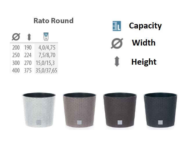 Eye-catching simplicity.A simple round pot with an elegant design that will blend in with any décor.Its texture gracefully imitates the performance of rattan, the appearance of which has been fitting into every arrangement trend for years.Made of plastic, it is resistant to UV radiation, mechanical damage and chemical compounds such as acids, bases or esters.In addition, the pot is much lighter than its counterparts made of ceramic or metal.Offer composition:1 pcs. – Flower pot1 pcs. – Removable InsertFEATURES WORTH EMPHASIZING:LIGHT – The pot is definitely lighter than its ceramic or metal counterpartsRESISTANT TO EXTERNAL CONDITIONS – Moisture, UV radiation or temperature changes do not change the value of the product.RESISTANT TO CHEMICAL COMPOUNDS – Made of plastic, it guarantees resistance to alkalis, acids or esters that are part of various plant fertilizers.RESISTANT TO MECHANICAL DAMAGE – The pot is resistant to scratches and breakage.EASY TO CLEAN – The structure of the performance from which most of the dirt comes off with a wet cloth or sponge.REMOVABLE INSERT – Facilitates replanting plants and makes the construction of the pot even more stable.(HxWxD):200mm {190x200x200mm} 250mm {224x250x250mm} 300mm {270x300x300mm} 400mm {375x400x400mm}