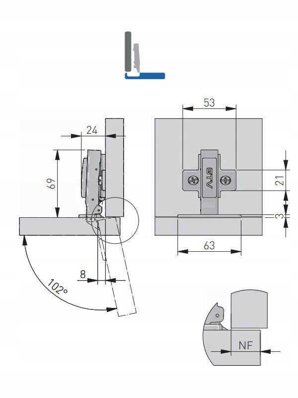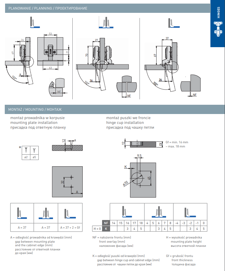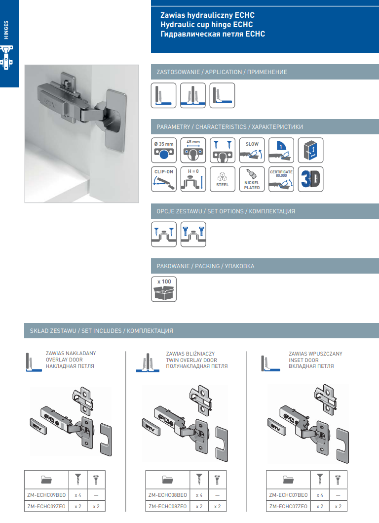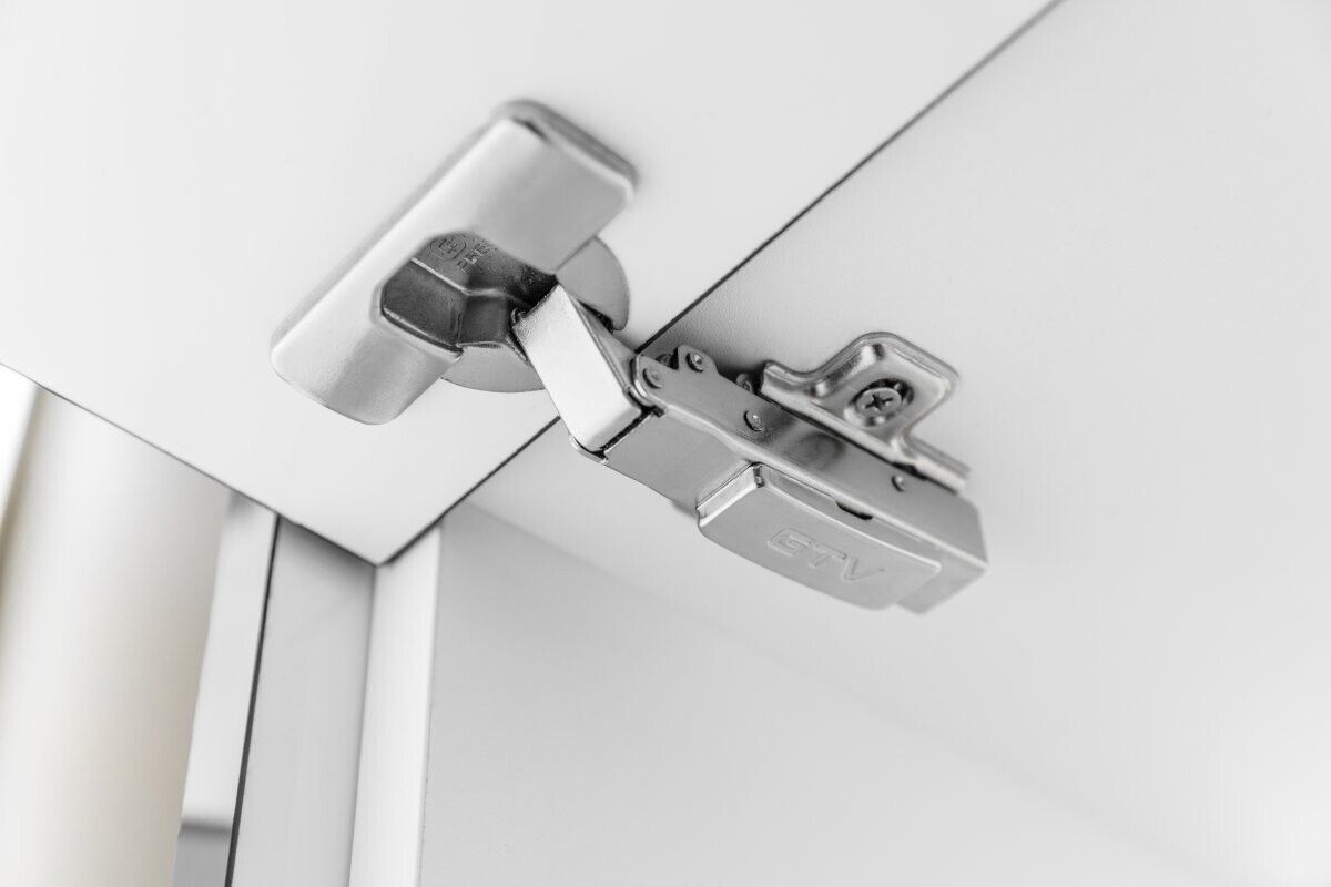 This hinge is characterized by high quality and durability rated for 80,000 cycles. With the soft-close technology, it ensures quiet and trouble-free operation, preventing slamming. Adjustment in three planes allows for proper fitting of the hinge during installation, and the use of the detachable “clip-on” guide facilitates front assembly and disassembly. The set includes cup and arm covers, providing an aesthetic and attractive appearance after hinge installation. The product is made entirely of steel.