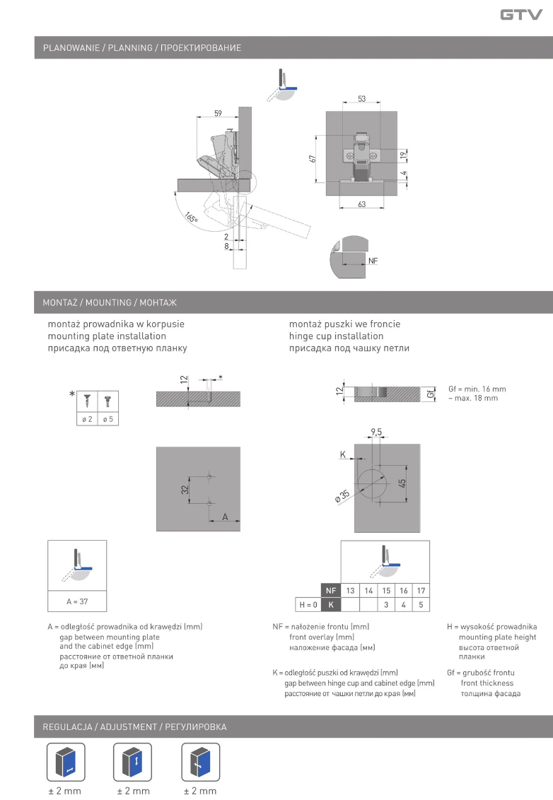 Our hinge is characterized by high durability, calculated for 80,000 cycles. Thanks to the silent closing technology, our hinge ensures quiet and trouble-free operation. Adjustment in three planes allows the hinge to be properly adjusted during assembly, and the use of clip-on technology facilitates the assembly and disassembly of the front. The set includes a cap for the can and arm, which provide an aesthetic and attractive appearance when the hinge is mounted. The product complies with PN-EN 15570:2010 / EN 15570:2008 standards.