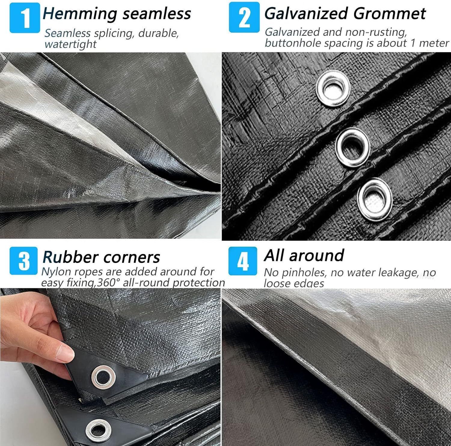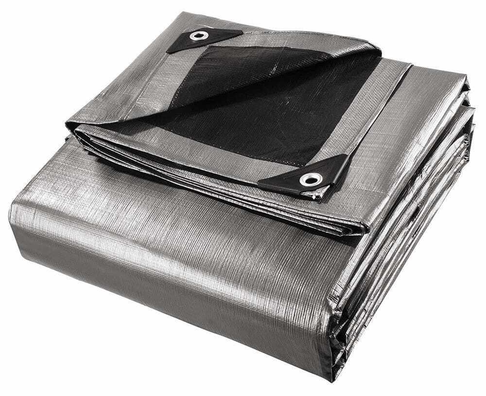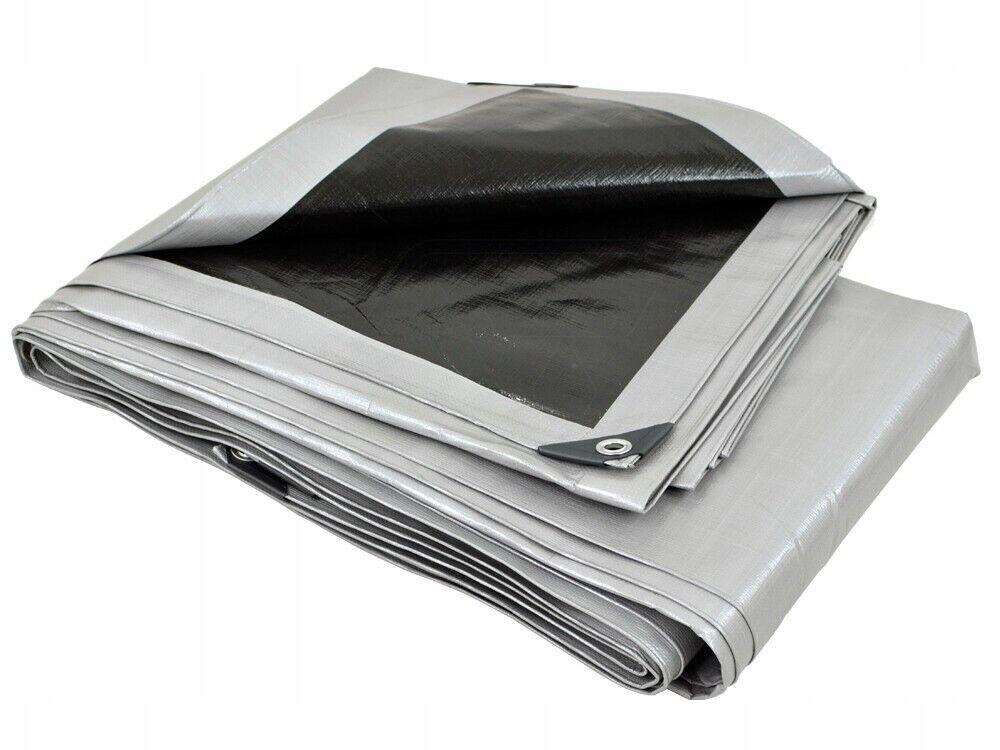 A very thick silver and black tarpaulin with a weight of 320g/m2 is durable and solid.