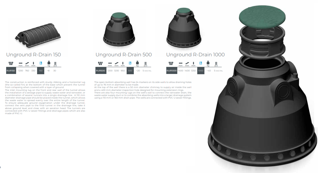 Retention and infiltration system: Principle of operation: rainwater flows down drain pipes and is collectively transported to an underground rainwater filter or goes to a basket filter placed directly in the tank. The rainwater is stored in the tank. Only when it is full, water flows into the infiltration system. Only water that does not fit in the tank goes to the rainwater infiltration system. Absorbent wells are used for storage and then infiltration of accumulated water in the ground. They are used to drain rainwater from the roof and sewage water from household biological sewage treatment plants. They are usually bell-shaped without a bottom, with holes in the lower part. The water is infiltrated through layers of gravel of appropriate granulation. The infiltration well can be used in permeable and poorly permeable soils only if the distance between the bottom of the well and the groundwater level is not less than 1.5 m. The location criteria for absorbent wells are analogous to the conditions provided for the use of traditional drainage systems. When determining the dimensions of wells with a circular base, the area of the bottom and walls of the excavation is taken into account as the total filtration area. In accordance with the adopted law, rainwater is considered sewage, and therefore you have to pay tax for its discharge. However, it is worth taking care of the use of rainwater. An absorbent well works best for this purpose. Thanks to it, you can easily drain water to the level of permeable soil. This translates into many benefits, especially when the well is part of household sewage treatment plants.